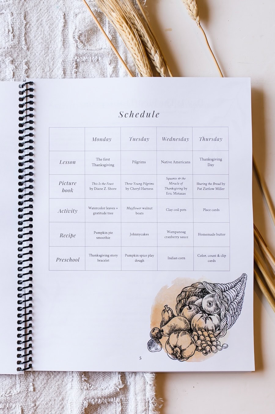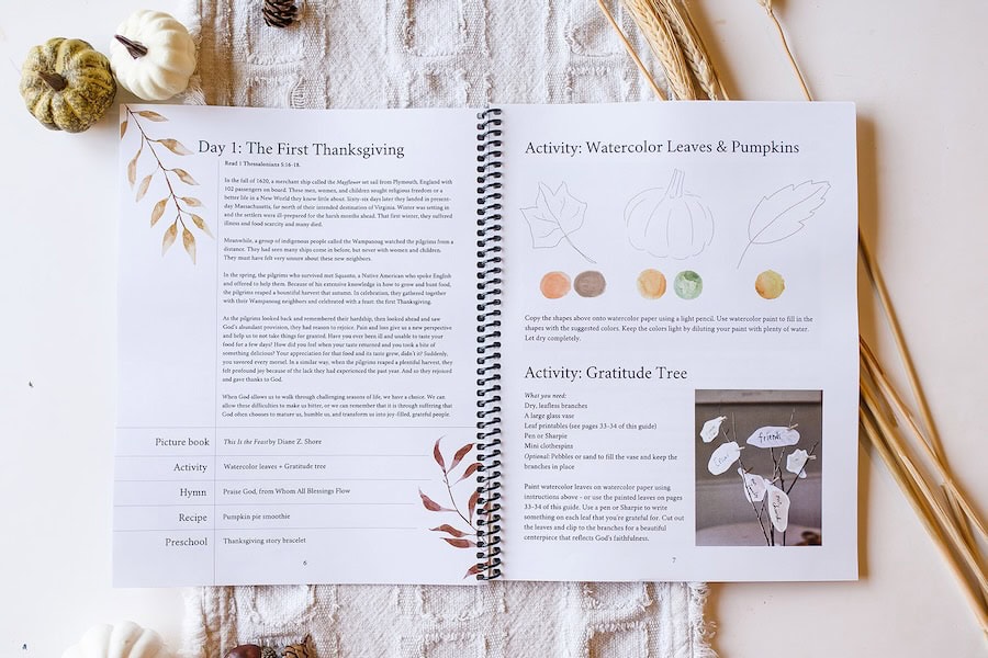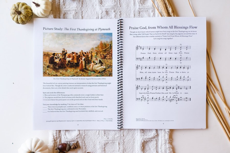 The guide is structured for four days of study, typically used Monday through Thursday of Thanksgiving week, but includes enough material to stretch it across one to two weeks depending on your family’s rhythm.